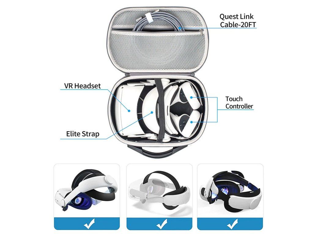 Robustní pouzdro je navržené pro bezpečné uložení headsetu Meta Quest a jejich příslušenství. Je voděodolné, narozdíl od svých konkurentů se dá nosit i za deště a zároveň jeho povrch umožňuje snadné čištění. Dále pak ochraňuje zařízení před otřesy a nárazy. Bez problémů do něj uložíte ovladače, nabíjecí kabel, napájecí adaptér a Elite Strap.